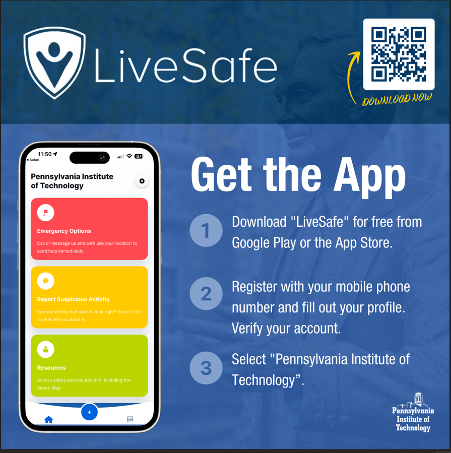 There will be times when it is critical that PIT relay information to the College Community quickly- for example, inclement weather closings. For our EMS system, we use LiveSafe, an app that is available for download on all platforms. We encourage you to download the app so that you can remain informed. This is a two-way communication app- if needed, you can inform college leadership in real time about an issue that you see- for example, perhaps you realized that there was a leak. You can use the app to share that information, with the exact location and details of whats happening.