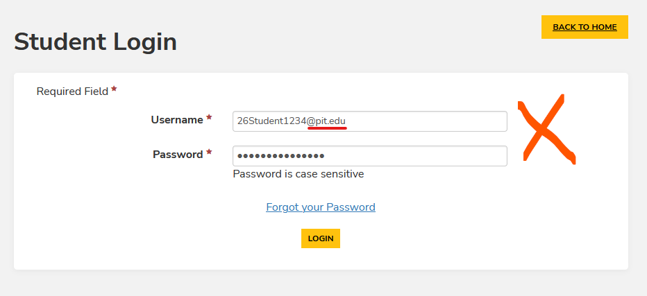 Please be advised that our Student Portal does not accept email addresses for login. Your username for the Student Portal is the same as your email address, but without the “@pit.edu” portion.